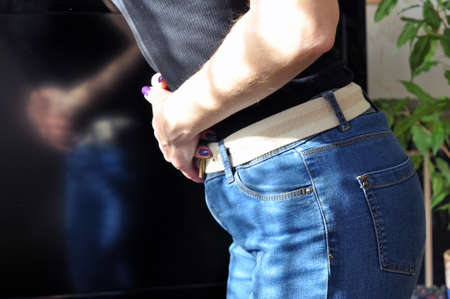 A person is showcasing a casual style in tight jeans that compress the waistline, creating a belly bulge above the waistband, highlighting realism.