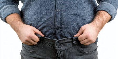 Man showing his belly fat and difficulty closing tight jeans, symbolizing weight gain, body image issues, and the challenge of obesity or unhealthy lifestyle