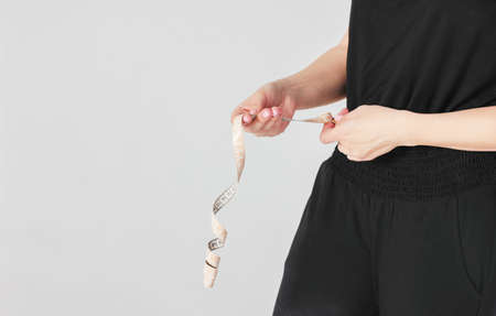 A skinny woman wearing black pants uses a tape measure around her waistline against with white background. Health care concept.