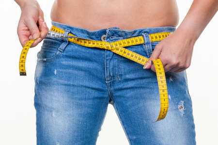Close up of slim woman measuring her waists size with tape measure. Isolated on white background.