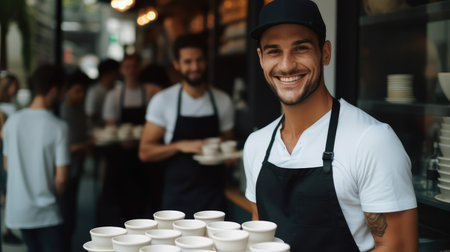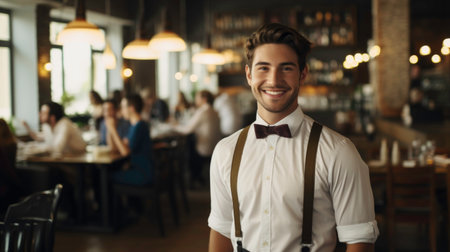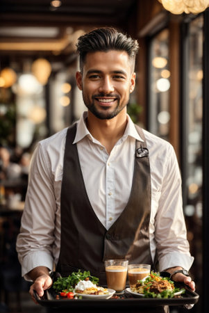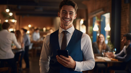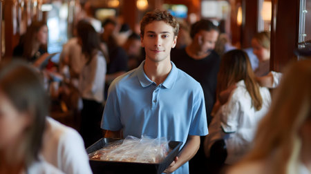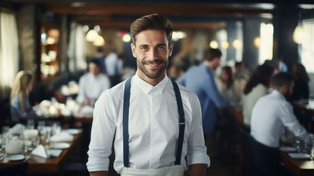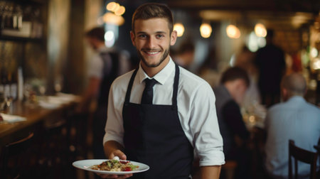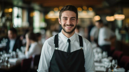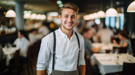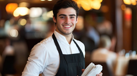 Attractive young waiter with a welcoming smile, holding customer orders. Wearing an apron in a busy daytime restaurant, perfect for hospitality themes.