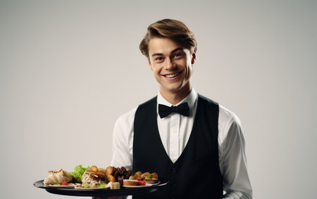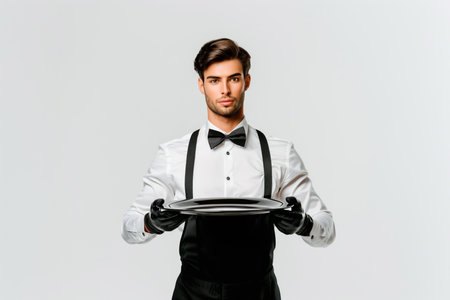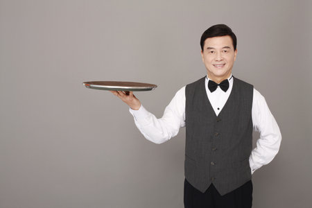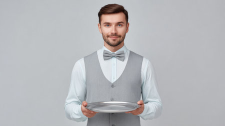 A professional male waiter in formal attire holds a silver serving tray against a gray background, ideal for hospitality, dining, and service themes.