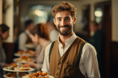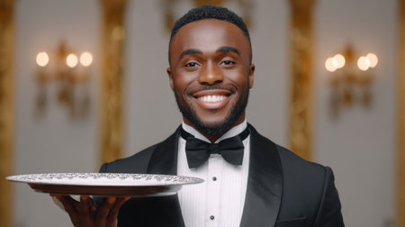 A well-dressed male waiter stands in an elegant indoor setting, holding a silver platter and smiling warmly, embodying professionalism and hospitality.