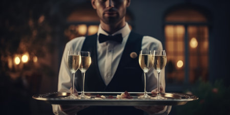 a waiter in a suit stands with a tray on which there are two glasses of champagne for guests of a luxury restaurant