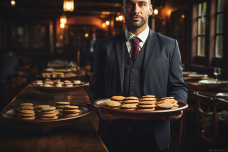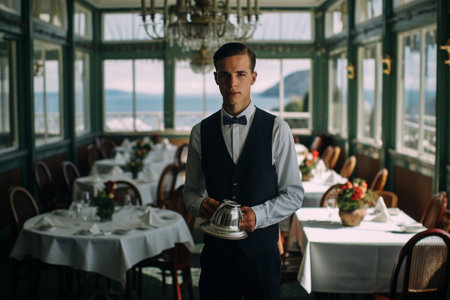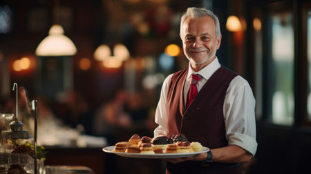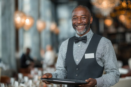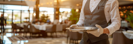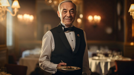 Seasoned waiter in black vest holds silver tray in grand dining room