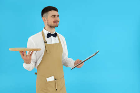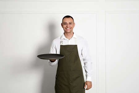 Portrait of happy young waiter with tray near white wall
