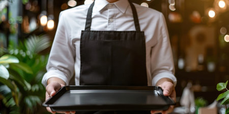 Server in apron presenting empty tray against textured backdrop