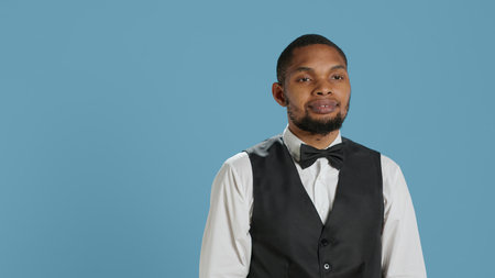 Friendly bellman porter with suit and tie waving at hotel guests, greeting people and offering excellent concierge services. Young employee saying hello to clients against blue background. Camera A.