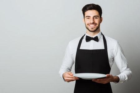 A cheerful waiter in a bow tie holds a white plate ready to serve customers in an elegant dining environment.