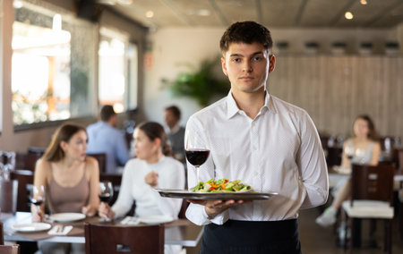 Young happy waiter while serving food in a restaurant
