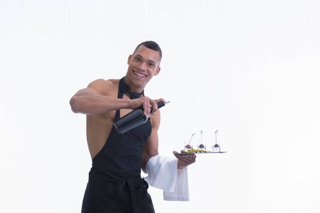 Happy Beautiful and attractive Waiter in Portrait Isolated on White Background