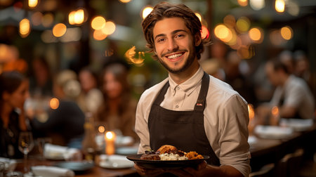 Portrait of a smiling waiter holding a plate with food at a restaurant