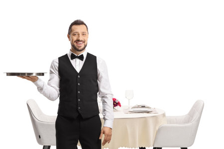 Server with a silver tray standing in front of a restaurant table isolated on white background
