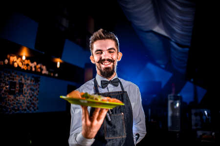 Stylish garcon serves dish on a black background.