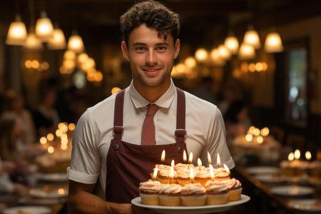 waiter in cafe holding bithday cake.