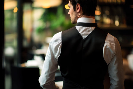 A man in a waiter vest gazes out the restaurant window at tables set for service This shot is perfect for hospitality or service themes.