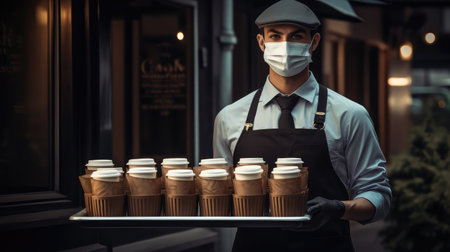 tray empty coffee cups illustration apron smile, shop customers, drinks stacked tray empty coffee cups