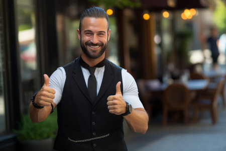 Thumbs Up Triumph: A Cheery Man in a Stylish Black Vest