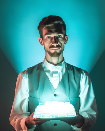 Portrait of a handsome young man in a suit holding a luminous light box.