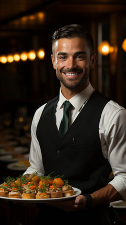 a professional waiter in a fine dining restaurant, holding a tray, smiling