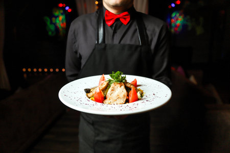 A professional waiter in uniform holds plates against a dark backdrop, suggesting service excellence and attention to detail, use for restaurant or hospitality promotions.