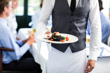 Close-up of waiter holding plate of meal in restaurant