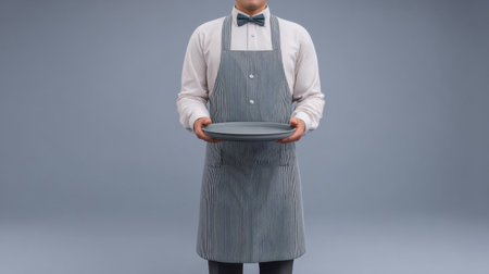 Professional waiter in formal attire holds an empty plate, ready to serve. The gray background adds a modern touch to this elegant hospitality scene.