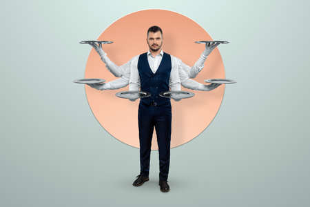 Waiter six hands, many hands. Creative portrait of a waiter with empty trays in his hands, a good worker, a spider, a professional. Modern design, layout, poster