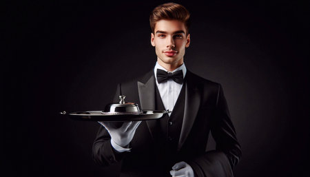 A sophisticated waiter in a black tuxedo holds a silver platter, demonstrating poise and professionalism. The dimly lit background accentuates the contrast of his crisp attire and the elegance of the serving tray.