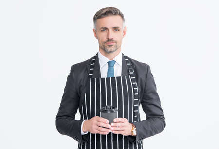 mature man in suit and apron hold coffee isolated on white background with copy space