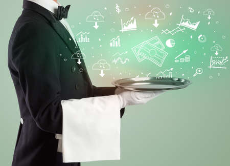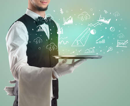 Handsome young waiter in tuxedo holding money icons on tray