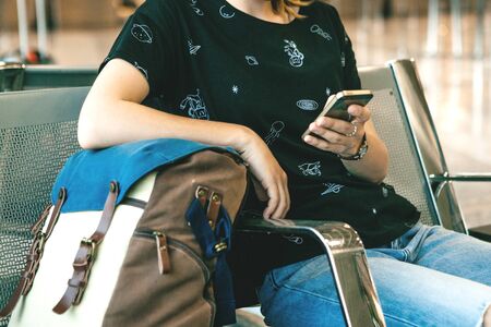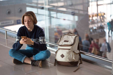 waiting for a flight at the airport. girl with a phone and a backpack sits on the floor