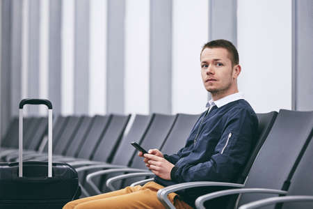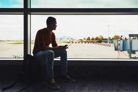 Man traveling by airplane. Young passenger waiting in airport terminal.