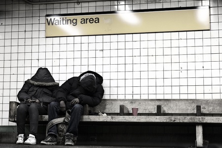 New-York, USA - November 14th, 2012: Two anonymous ault people sitting on a bench at a subway station's designated waiting area, hidden behind their coats, appear to be sleeping.