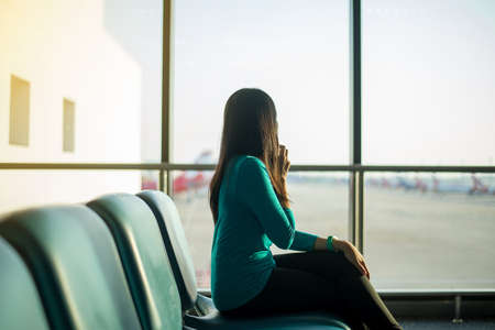 A young woman is sitting in the airport and looking at the table board