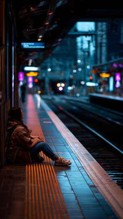 Young man sitting on the platform of a train station at night.