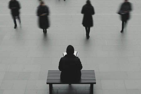 A lonely immigrant watches people pass by, feeling invisible and disconnected