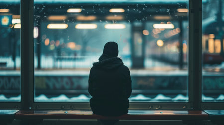 Woman Sitting Alone on a Bench, Feeling Pensive in a Modern Station With Teal Walls During Late Afternoon
