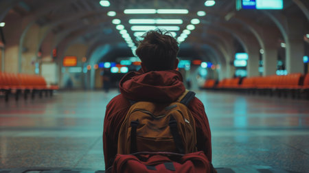 A lone traveler waits at the airport, sitting on a bench in the terminal, surrounded by rows of empty seats. The overhead flight information display boards are visible in the background, showing the bustling environment of air travel.
