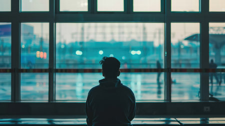 Silhouette of a man looking out the window of an office building