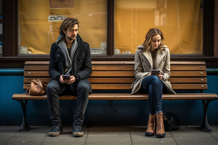 The Unspoken Connection: A Man and Woman Seated on a Rustic Brown Wooden Bench --ar 3:2