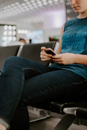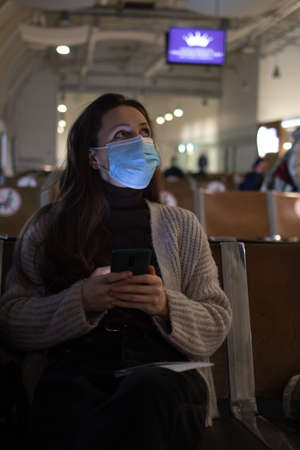 Casual young girl in mask with smartphone in airport lounge. Air travel under quarantine conditions