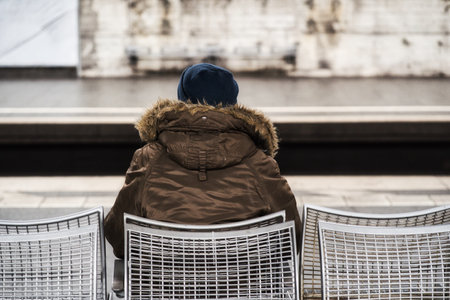 BILBAO, SPAIN-MAY, 5TH, 2022: Vertical view of backwards sitting woman wating for the underground to come