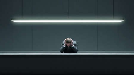 A person sits at a desk holding their head in frustration in a corporate setting with a strong light overhead.