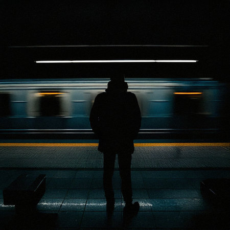 Commuters Blur On Train Platform, Hurried Silhouettes Reflected On Metal Railing, Backpacks And Briefcases In Motion, Cool Fluorescent Light And Transient Urban Anonymity