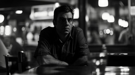 Pensive man sitting alone at the counter in a pub, drinking alcohol and looking away with a thoughtful expression