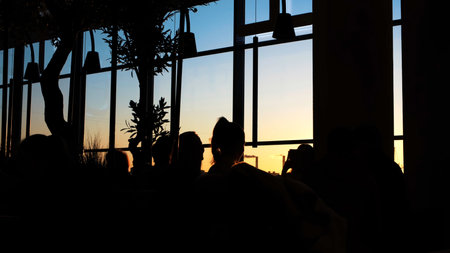 Close-up of people silhouettes standing in the dark room near the window at the sunset. Concept. Evening observation platform