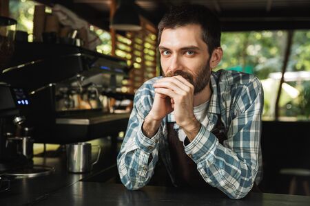 Portrait of bearded barista guy wearing apron smiling at camera while working in street cafe or coffeehouse outdoor