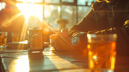 Person enjoying a relaxing evening with a glass of beer, while keeping track of time with an alarm clock in the background