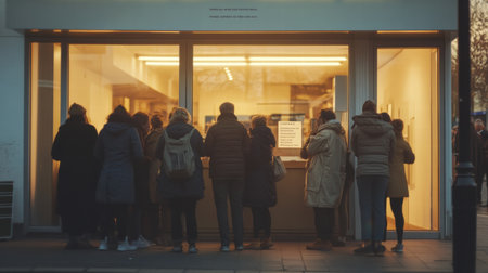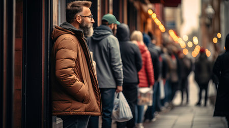 A bustling line snakes around the storefront, anticipation thick in the air Shoppers eagerly await the store's doors to open, buzzing with excitement for sales, discounts, and the promise of hot deals The crowded queue captures the collective energy of a shopping spree about to begin AI Generative